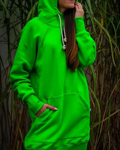 Długa Damska Zielona Bluza Bawełniana Z Kapturem W Kolorze Zielonym z ciepłym dużym kapturem, kieszeniami i dolnym ściągaczem.