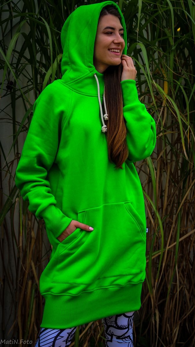 Długa damska zielona bluza bawełniana z kapturem , jest dostępna w trzech rozmiarach – XS, S/M i L/XL